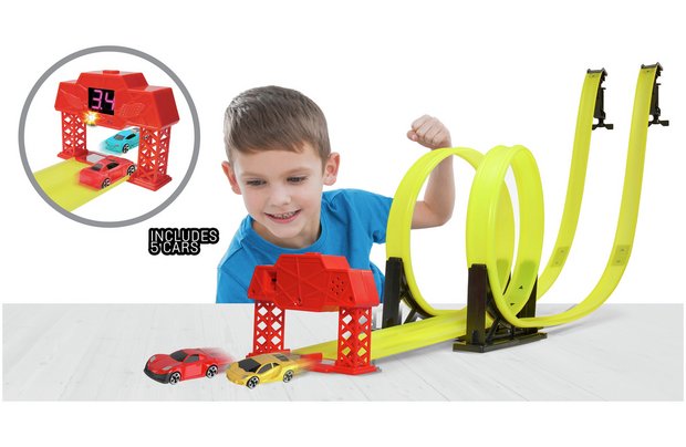 Coming with five (5) metal die-cast racers, this Chad Valley Street Showdown Racing Track & Cars Set is sure to be a massive hit with your most cherished and their friends. Place up to two cars in the gravity twin launcher then push the button to begin the countdown. Cheer on your racer as they zip along the track and through the loop at exhilarating speed. This race could be a close one! Luckily the finish gantry shows winning lane detector and race time notification so disputes will be settled quickly. A nice added bonus is that the track pieces of this amazingly exciting gravity fed two lane racing track is compatible with other Chad Valley track sets (Size H44, W120, D15cm).